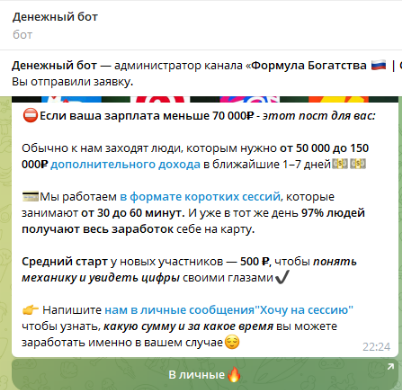 Очередная афера: обещают из 500 рублей сделать 50 тысяч за сутки. Такие сказки только для наивных. Без лицензий, без гарантий, только пустые слова. Деньги отправишь — и прощайся с ними. Не ведитесь на этот развод.