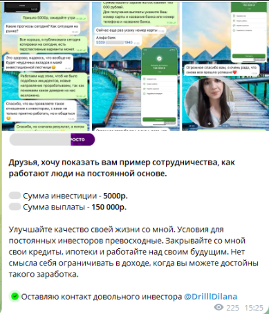 Общение с аудиторией девушка ведет через бота, что позволяет мошеннице сохранить анонимность. Она рассказывает о коротких торговых сессиях и гарантирует клиентам выплаты на их банковские карты.