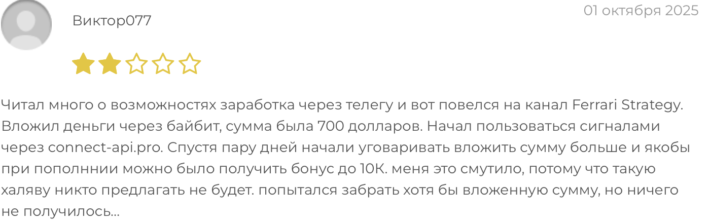 Проект «Метод Феррари» вызывает серьезные сомнения: отсутствие прозрачной статистики, анонимность автора и негативные отзывы пользователей. Риск потери средств слишком высок, чтобы доверять этому предложению.