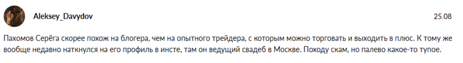 Любое взаимодействие с Сергеем Пахомовым — высокий риск потери средств и времени. Советуем избегать данного трейдера и предупредить о его мошеннических схемах знакомых. Комментируйте данную статью и делитесь вашими мыслями о подобных «гуру» трейдинга.