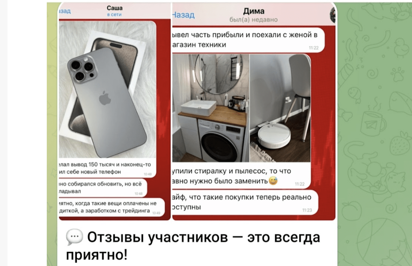 - Чтобы привлечь как можно больше людей, сперва им демонстрируются впечатляющие показатели ROI и скриншоты по отдельным сделкам с плюсами вплоть до 550% при кредитном плече х50. Вдобавок потенциальным партнерам обещают круглосуточную поддержку, личные созвоны с наставником, быстрый путь к стабильному заработку «без рисков». Все это приправлено стандартными методами увеличения продаж: якобы мест в группу очень мало и забронировать их можно «только здесь и сейчас».
