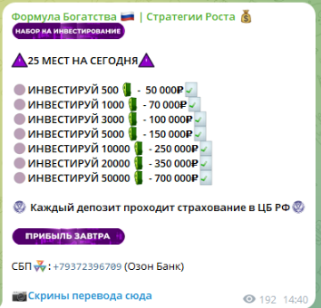 Телеграмм-канал «Формула Криптобогатства | Ежедневный Капитал» отзывы получает негативные, хотя не раз менял название и юзернейм, чтобы скрыть репутацию. В этом обзоре разберем, как устроена обещанная раскрутка депозита и откуда берутся проценты. Выясним, какие риски несет вкладчик, какие есть сомнительные моменты и как на самом деле работает схема.