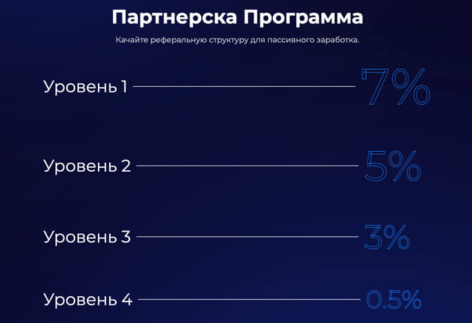 Главный «двигатель» проекта — не искусственный интеллект и не торговля криптовалютой, а многоуровневая партнерская программа. Пользователям обещают выплаты от 0,4% до 7% от депозита каждого приглашенного участника. Именно эта схема удерживала проект на плаву.