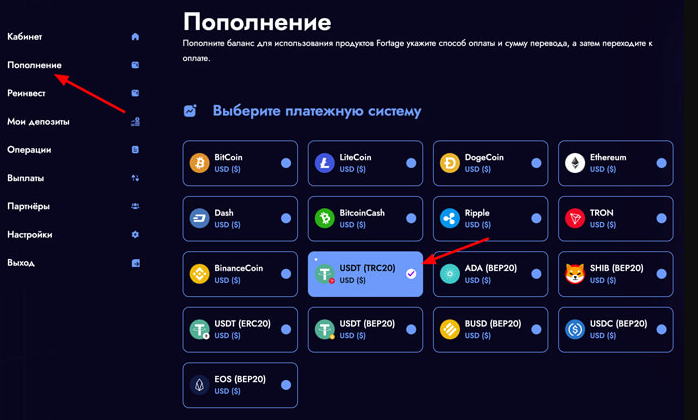Проверка выявила, что регистрация на сайте Fortage проходила подозрительно легко: никаких подтверждений почты или верификации по стандарту KYC не требуется. Для инвестиционного проекта, который якобы управляет средствами пользователей, такой подход выглядит крайне непрофессионально и опасно. С пополнением ситуация еще более странная. На счет можно отправить практически любую криптовалюту, принимают даже мемкоины, что абсолютно нетипично для серьезных платформ.