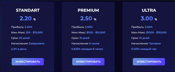 Предусмотрено несколько тарифных планов — Standard, Premium и Ultra, в рамках которых клиентам обещают от 2,2% до 3% прибыли в день при вложении от $10 до $30 тыс. Если перевести это в годовой процент, получается от 2800% до 48000% годовых. Такая доходность недостижима — ни один законный инвестиционный инструмент не дает подобных процентов. Когда вам обещают такие цифры, это почти всегда говорит о финансовой пирамиде, а не о реальных инвестициях.