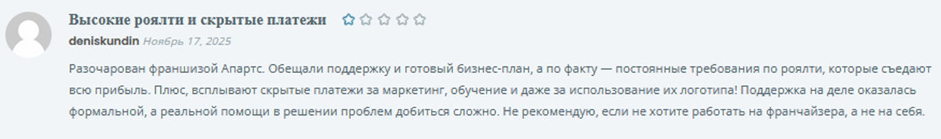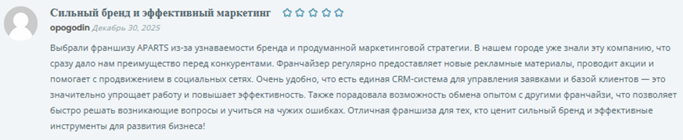 В сети можно найти различные отзывы о Франшизе Апартс. Но лишь небольшое их количество положительные. Такие комментарии напоминают рекламные лозунги, они однотипные, имеют заказной характер. Делают упор на узнаваемости бренда, консультационной и юридической помощи, быстрой самоокупаемости.