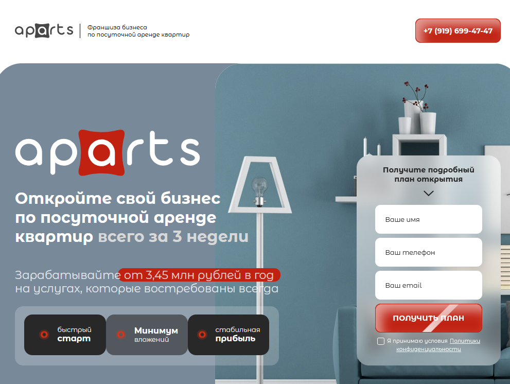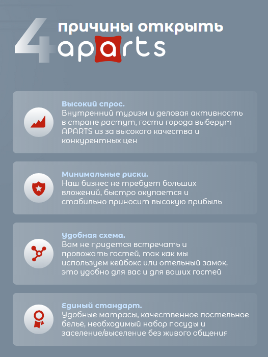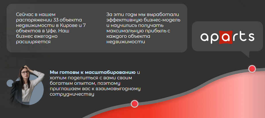 Компания Франшиза Aparts предлагает выгодный бизнес на посуточной аренде квартир и апартаментов. Это посредник, продающий права на франшизу и обещающий быструю окупаемость вложений.
