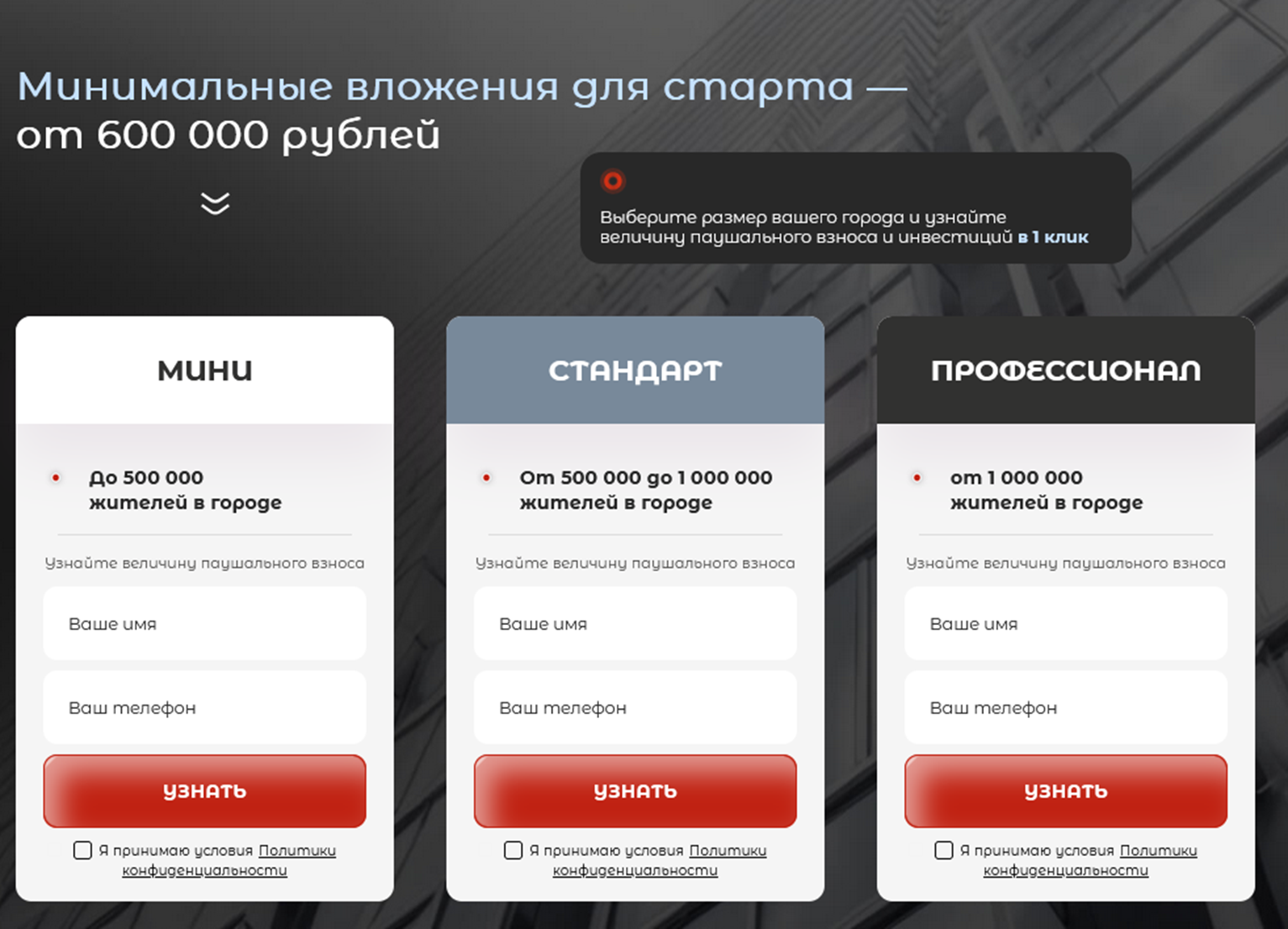 Потенциальным партнерам предлагается три варианта программы начального финансирования. Пакет Мини подходит для работы в городах с численностью населения не более 500 тысяч человек. Пакет Стандарт рекомендуется для городов-миллионников, Профессионал – при численности жителей более 1 млн. Подробных условий нет, предлагается оставить заявку для индивидуального обсуждения.