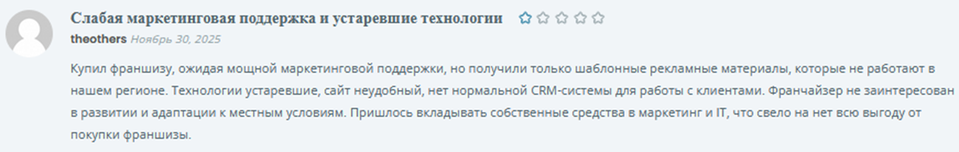 Найдены жалобы на отсутствие обещанной маркетинговой и консультационной поддержки. Готового бизнес-плана нет, вместо него дают шаблонные рекламные материалы, которые даже не учитывают региональных особенностей. Кроме того, есть скрытые платежи, в том числе, за использование логотипа, обучение. CRM отсутствует, маркетинг приходится заказывать с нуля. Прибыль при таких условиях минимальная, многие говорят об уходе в минус.