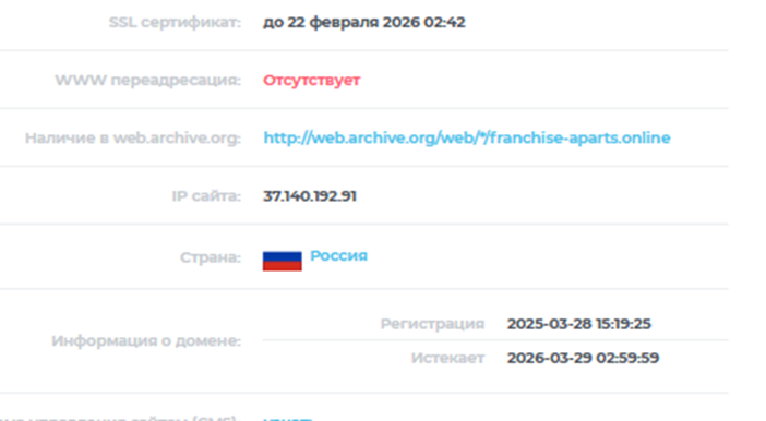 Компания заявляет, что работает на рынке недвижимости с 2019 года. Права на франшизу, якобы, продает с 2024 года. Но простая проверка показывает, что сайт Franchise Aparts Online был зарегистрирован через российский IP только 28 марта 2025. До этого момента информации о такой компании нет, данные об агентстве недвижимости или другой фирме с аналогичным названием не найдены.