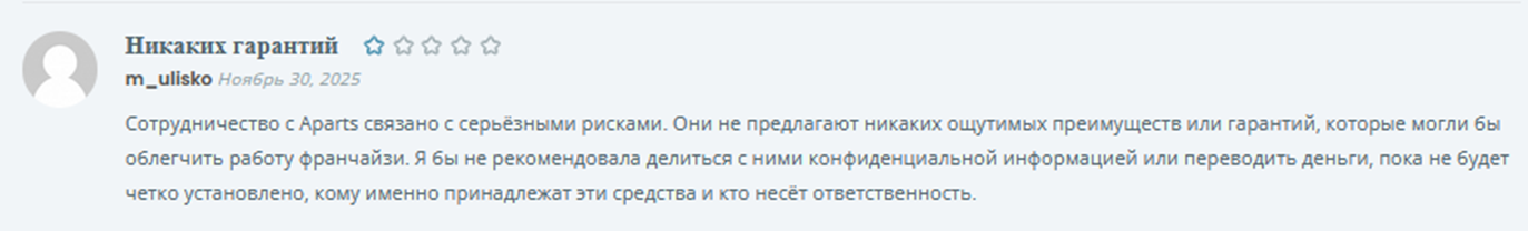 Если вы сотрудничали с компанией Франшиза Апартс, напишите о результатах партнерства. Ждем ваших комментариев.
