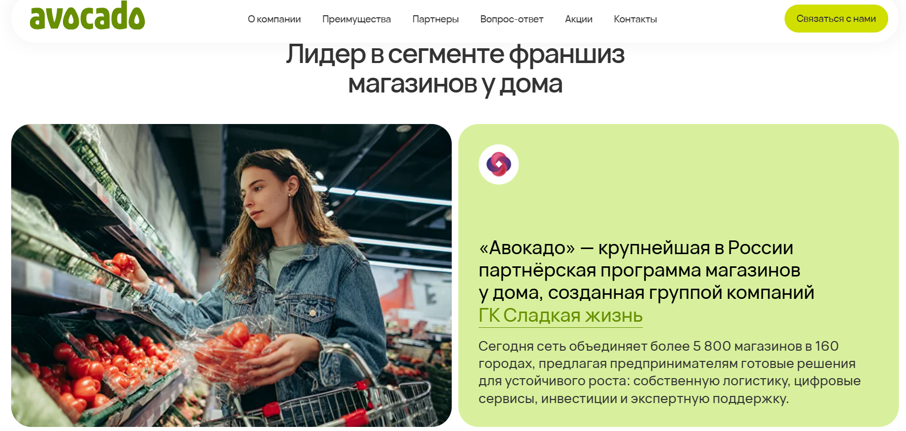 Франшизу по открытию продуктовых магазинов Авокадо продают с 2019 года. Ее создала группа компаний “Сладкая жизнь”, которая владеет сетью из более чем 5000 подобных магазинов в разных городах России.