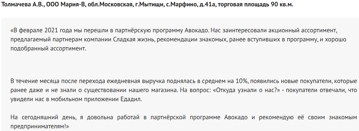На профильных ресурсах встречаются отзывы от тех, кто воспользовался франшизой продуктового магазина у дома Авокадо, все они положительные. Клиенты утверждают, что у них получается зарабатывать.