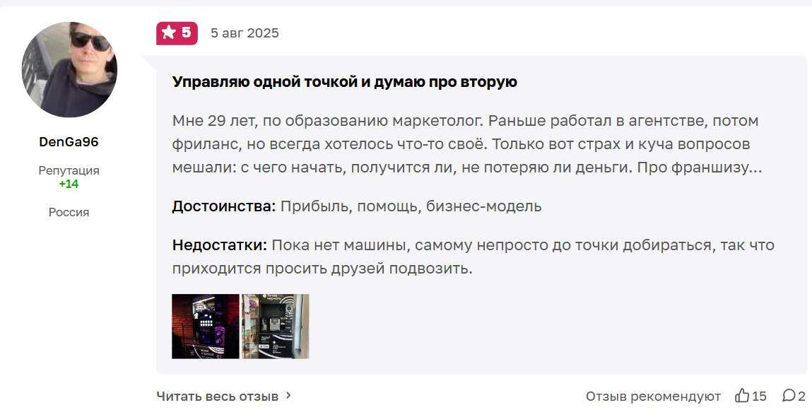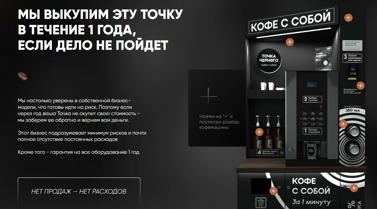 Владелец сети уверяет, что если у партнера не получится окупить стоимость кофейни за месяц, он выкупит ее по той же цене. Это большой плюс, так как исключает финансовые потери для инвестора.