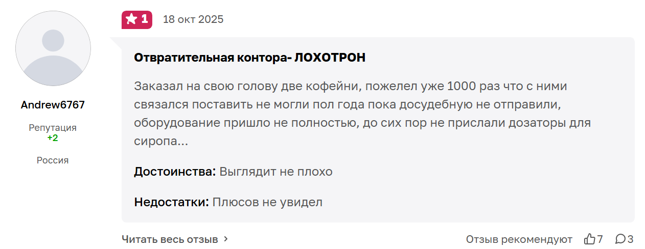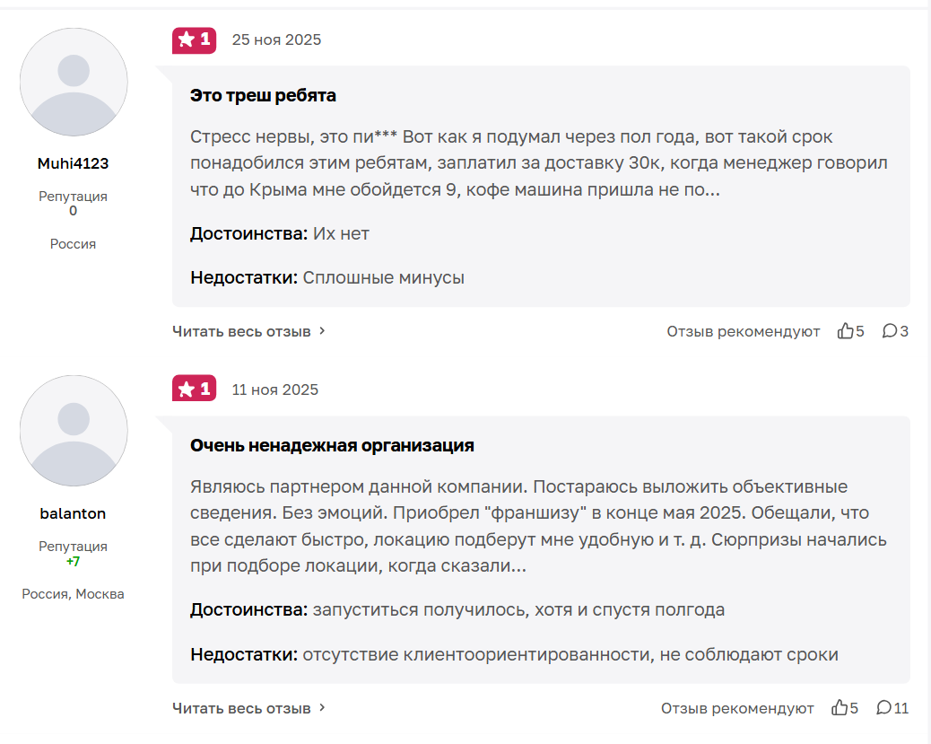 Компания «Точка черного» – легальная организация, поставляющая кофейни самообслуживания по франшизе. В мошенничестве не замечена, имеет много партнеров по всей России. Однако репутация у компании не идеальная. Много жалоб на несоблюдение сроков и неисполнение обещаний о помощи инвесторам в запуске бизнеса.