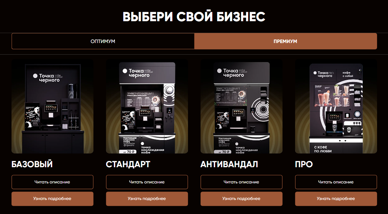 Сколько стоит франшиза «Точка черного», зависит от выбранной комплектации кофейного аппарата. Точные цены не указаны, нужно оставить заявку, менеджер перезвонит и все расскажет. Базовая комплектация включает: