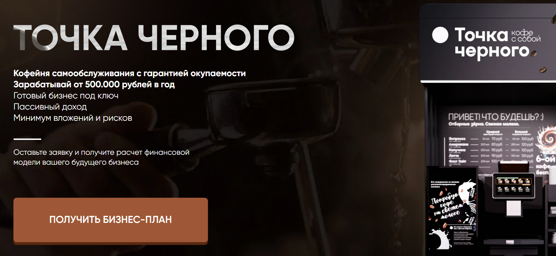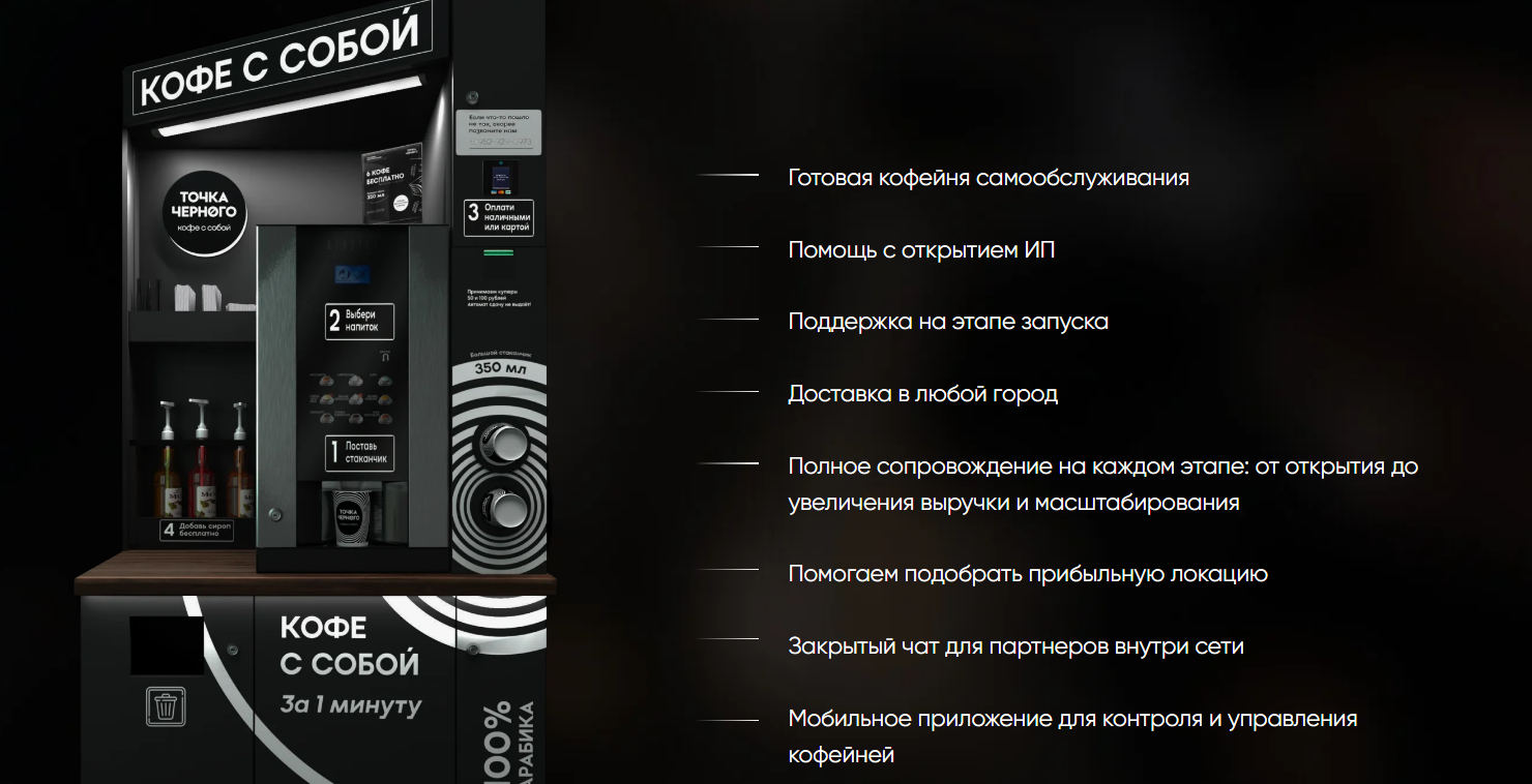 «Точка черного» – сеть кофеен самообслуживания. Предлагает сотрудничество по франшизе, обещая гарантированный доход и всестороннюю поддержку. Но репутация у нее неоднозначная. Подробнее расскажем далее.