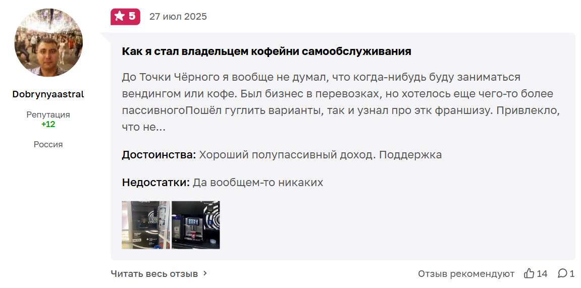 Честные отзывы предпринимателей об франшизе «Точка черного» в интернете в основном положительные, но есть и жалобы. Довольные инвесторы отмечают эффективную бизнес-модель, помощь в запуске кофейни, хорошую доходность.