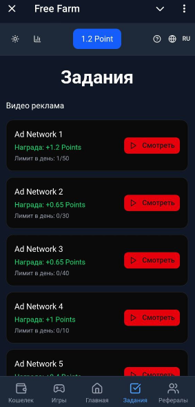 В качестве заданий в основном предлагают просмотр рекламы. Проект подключен к шести рекламным сетям, в каждой из которых есть дневной лимит и фиксированная ставка за просмотр. Реже встречаются задания по подписке на другие ресурсы и прочую активность.