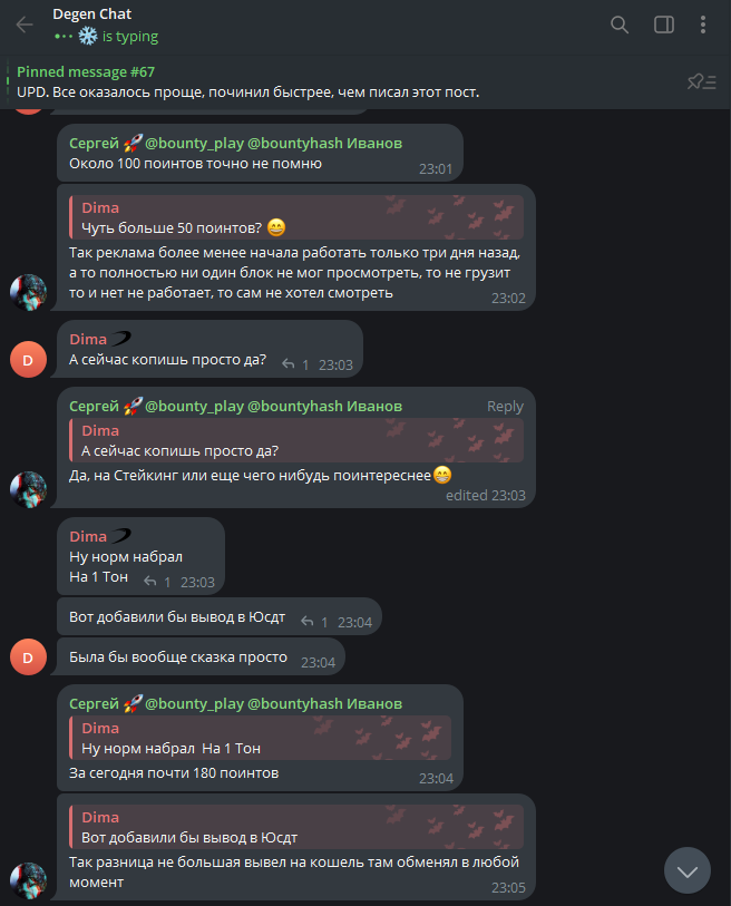 Выше было упомянуто сообщество, которое сформировалось вокруг данного бота. Чат наглядно показывает, что у проекта действительно есть аудитория. Здесь они как обсуждают вопросы по самой игре, так и общаются на отвлеченные темы. Администратор тоже участвует в дискуссиях. И судя по настроению пользователей, криптовалюту здесь действительно выплачивают.