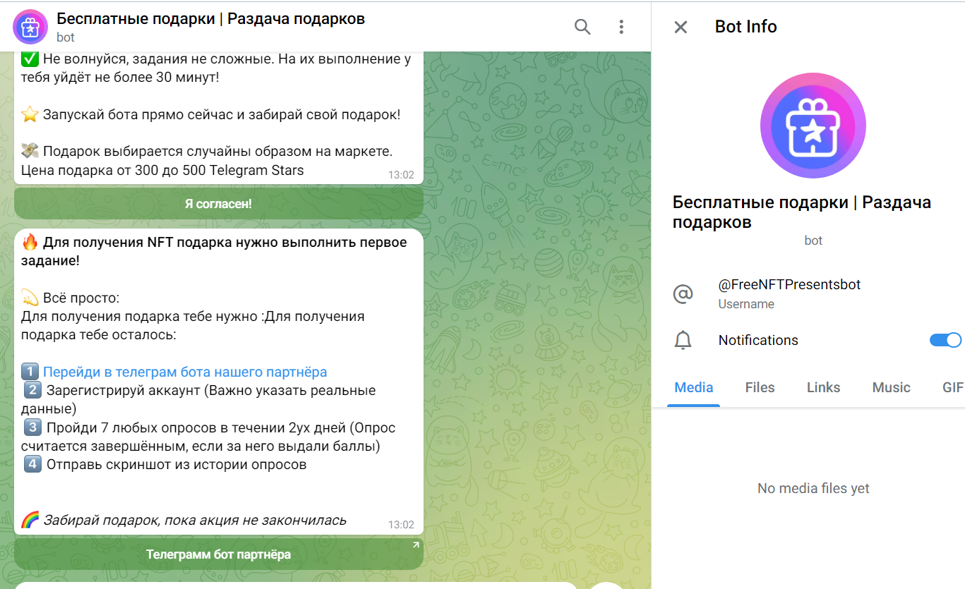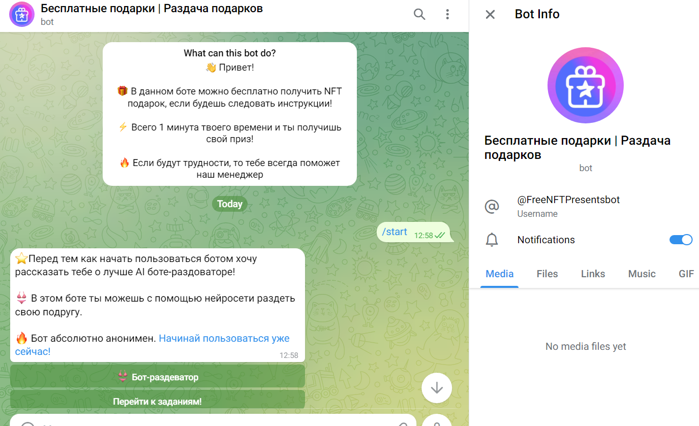 Этот «Freenftpresentsbot» — очередная замануха: ни сайта, ни контактов, а подарки за сомнительные задания. Пахнет разводом.