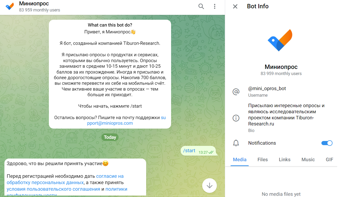 В предложенном боте присылают опросы о продуктах и сервисах, и они занимают по 10-15 минут. За пройденные опросы начисляют от 10 баллов, но иногда сервис может отправить опросы, стоимостью в 700 баллов. Как указано, баллы можно выводить на свой мобильный счет. Для увеличения заработка партнер бота Freenftpresentsbot предлагает проявлять больше актива.