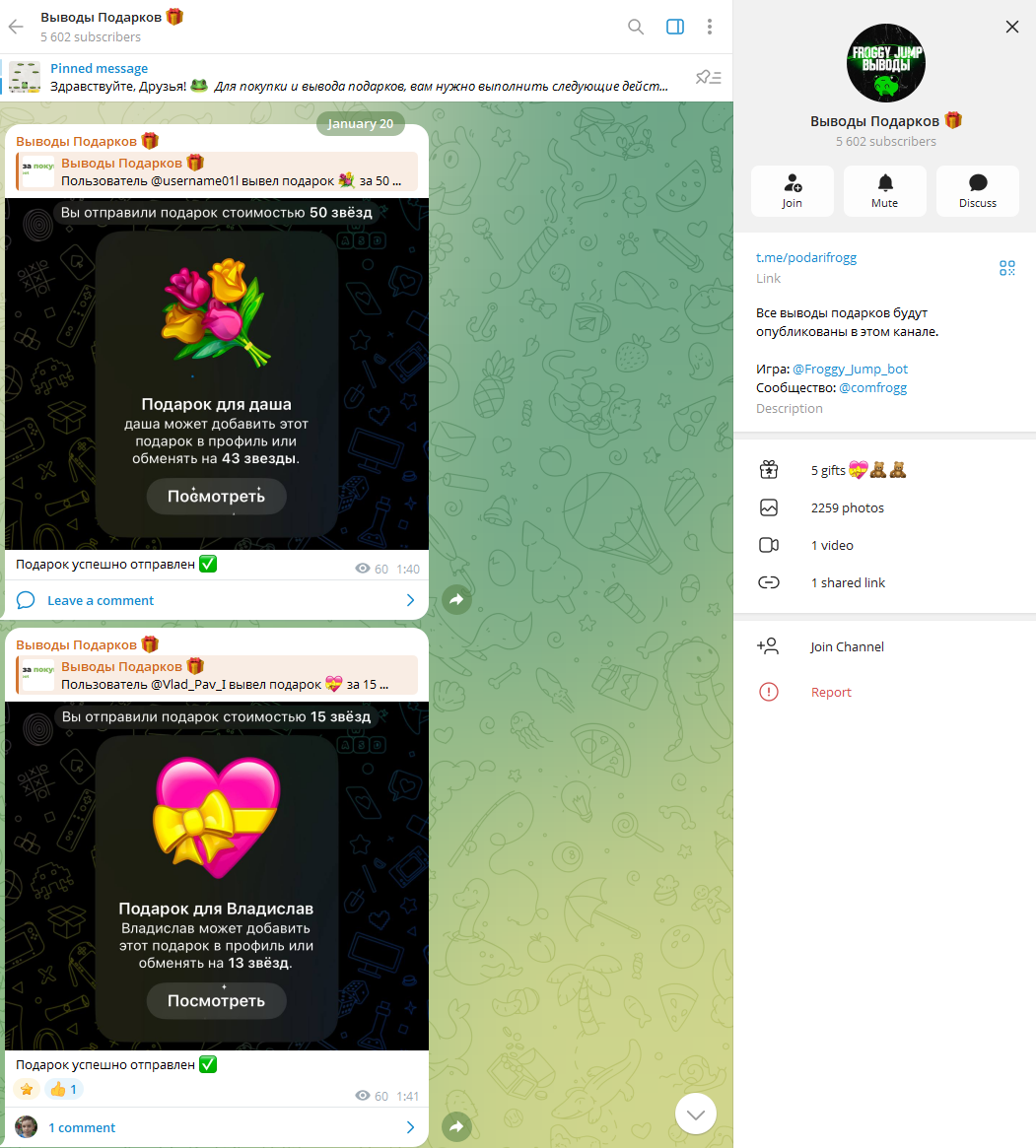 Froggy Jump Bot обещает возможность заработка, но для получения самого дешевого подарка за 15 звезд необходимо собрать 40 тысяч монет, что требует значительных временных затрат. Кроме того, пользователи сообщают о проблемах с донатами, которые не всегда проходят, и вложенные звезды исчезают с баланса. Проект работает с весны 2025 года, но так и не стал популярным, что вызывает сомнения в его надежности.