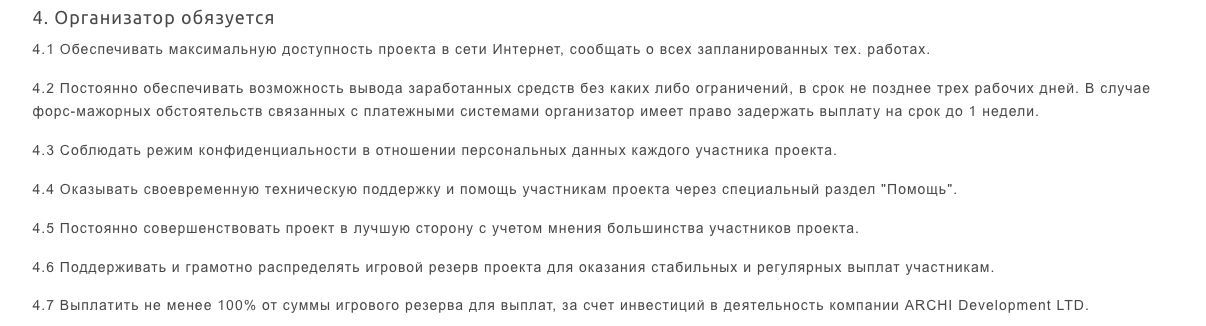 Из документов на сайте представлены Правила проекта, которые сводятся к тому, что Организатор должен выплачивать деньги из банка пользователям в качестве вознаграждения, но фактически особой ответственности за отсутствие выплат и не несет.