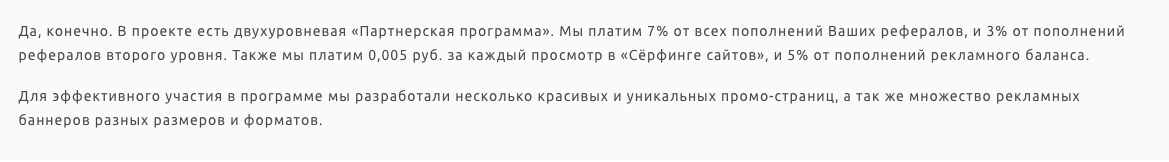 Само собой, доходность в данном проекте обеспечивалась путем перераспределения средств от инвесторов. Более ранние пользователи получали награды за счет пополнений от новых пользователей. Для привлечения аудитории использовалась двух уровневая рефералка с доходностью 7 и 3% от пополнений рефреалов.