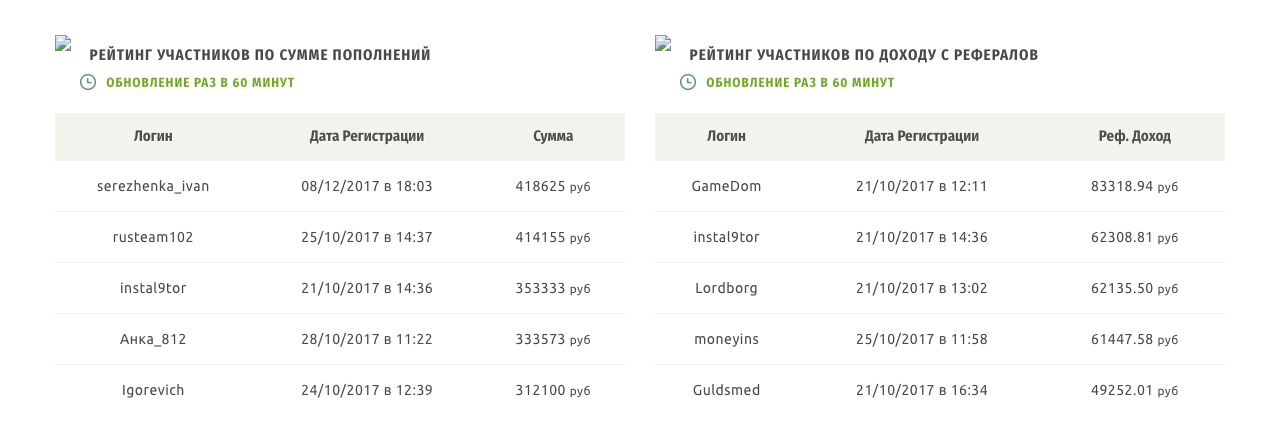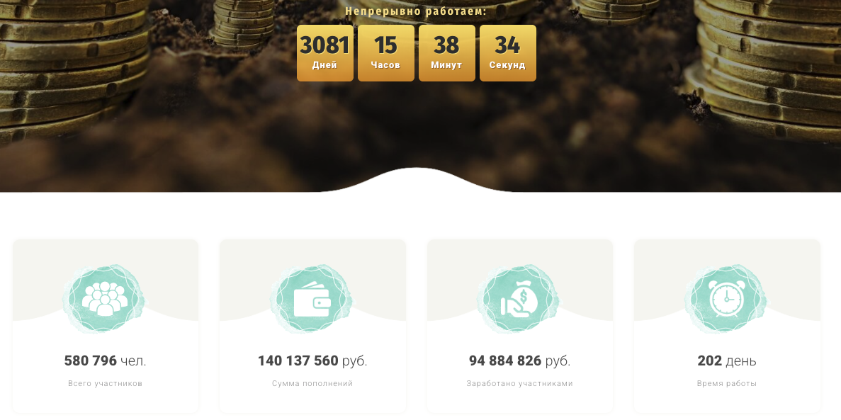 Данный проект, по всей видимости, уже давно не работает, хотя 1 из сайтов все еще активен. Перед нами была типичная финансовая пирамида, замаскированная под финансовую игру. Выделим основные моменты по обзору: