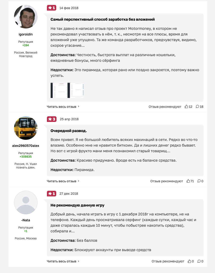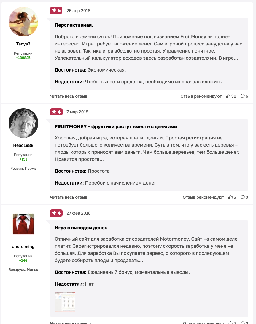 Отзывы о проекте Fruit Money перестали появляться еще в 2018 году. В них, как это обычно бывает с подобными сервисами, аудитория поделилась на 2 лагеря. Одни люди говорят, что проект интересен и платит: