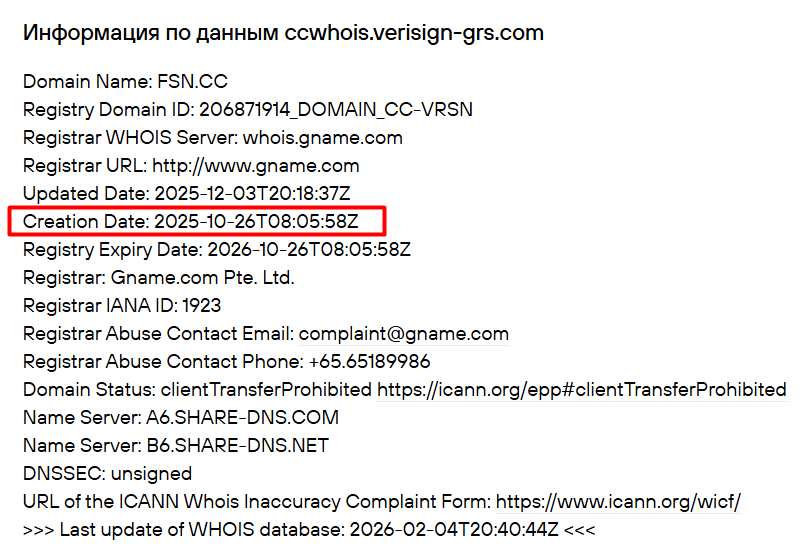 Согласно информации после проверки через сервис Whois, видим, что запущена эта инвестплатформа только 26.10.2025. Также заметно и то, что вся информация о лицах, которые зарегистрировали вообще сайт «Фсн сс», полностью скрыта шифром.