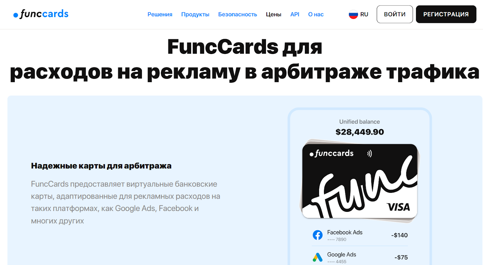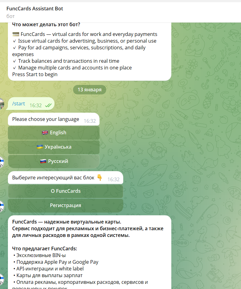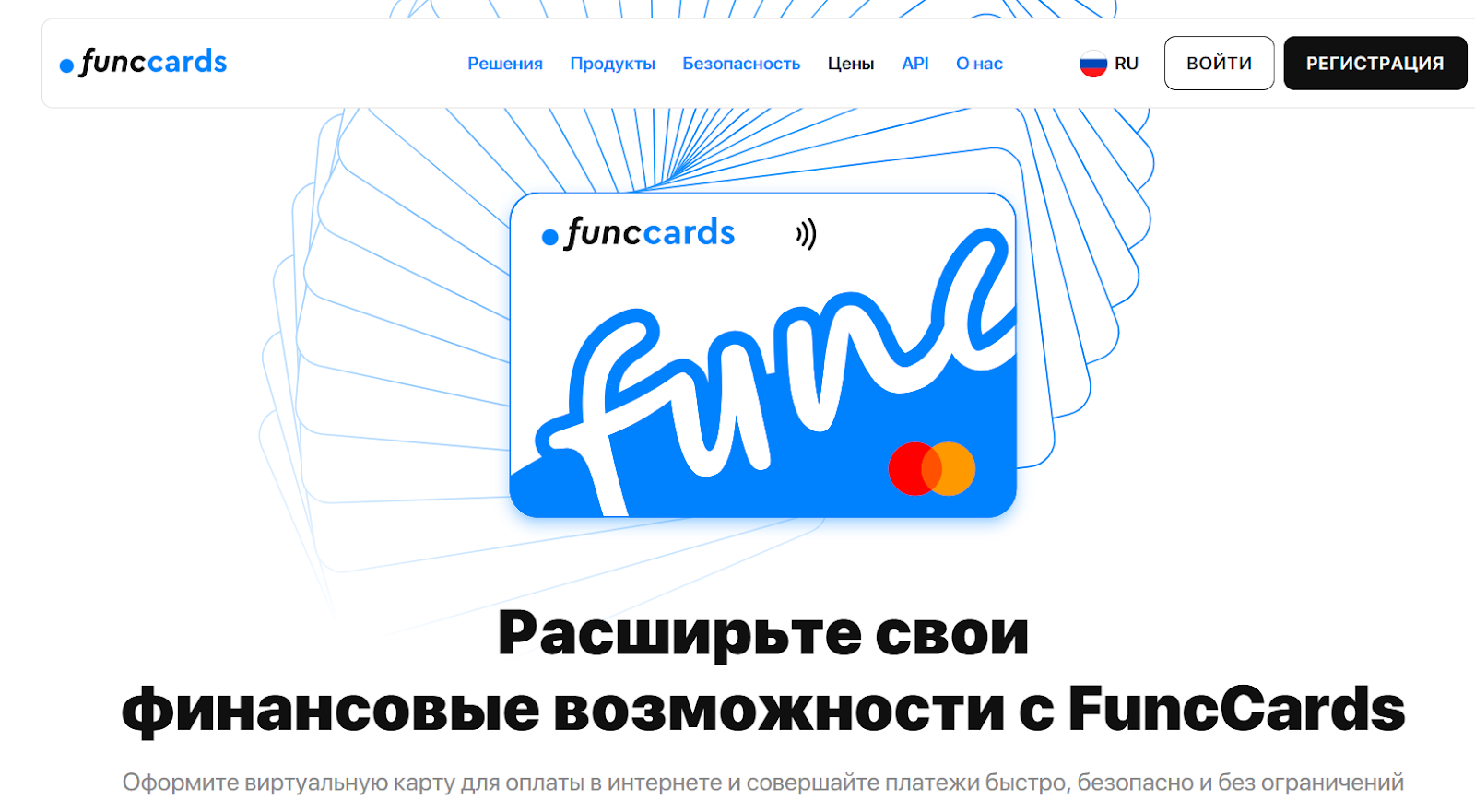 FuncCards — это финтех-система с виртуальными банковскими картами для онлайн-платежей, рекламы, бизнеса и повседневных расходов, которая работает через сайт и тг бота, презентуя себя, как универсальный инструмент для управления платежами в одном аккаунте.