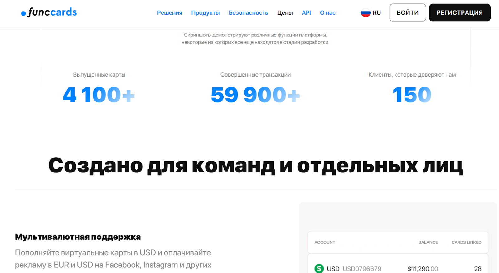 Сайт сделан в современном корпоративном стиле, много внимания уделено интерфейсу, безопасности и удобству. Сервис предлагает выпуск виртуальных карт в реальном времени, создание карт под разные задачи, единый баланс, мультивалютную поддержку, работу с рекламными платформами вроде Google Ads и Facebook.