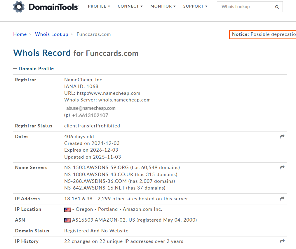 Домен зарегистрирован 3 декабря 2024 г., работает через инфраструктуру Amazon AWS, SSL-сертификат действующий. Регистратор NameCheap, данные владельца скрыты.