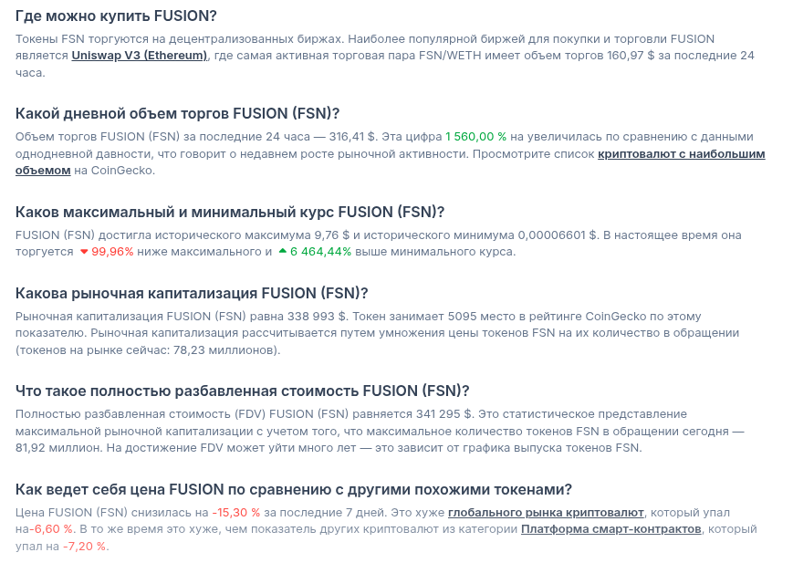 Fusion (FSN торгуется преимущественно на Uniswap V3 (Ethereum), но и там объемы мизерные – около $160 за сутки. В общем, классическая «ловушка ликвидности».