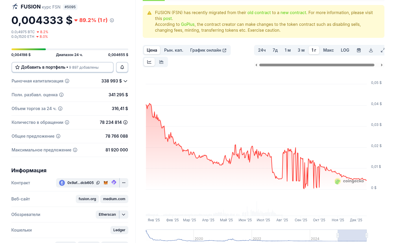 Также важно отметить технический риск: агрегаторы предупреждают, что FSN недавно мигрировал со старого контракта на новый. Такие переезды часто чреваты потерей средств для невнимательных юзеров, путаницей с тикерами и возможностью для создателя контракта вносить изменения (например, отключать продажи), о чем прямо предупреждает GoPlus Security.
