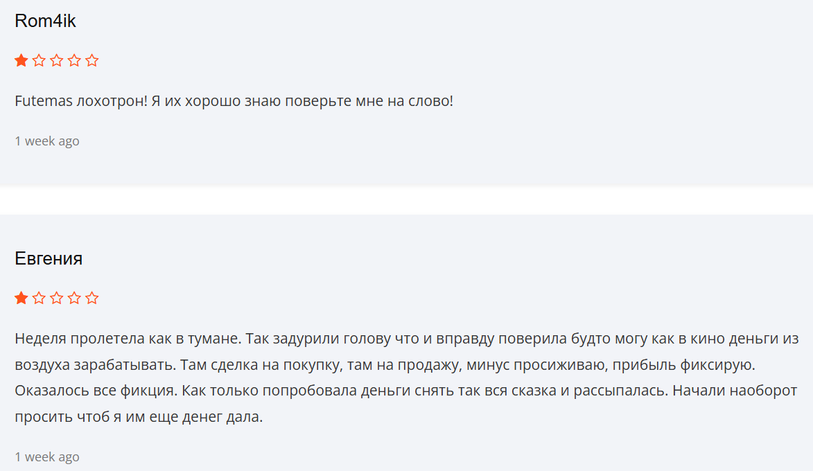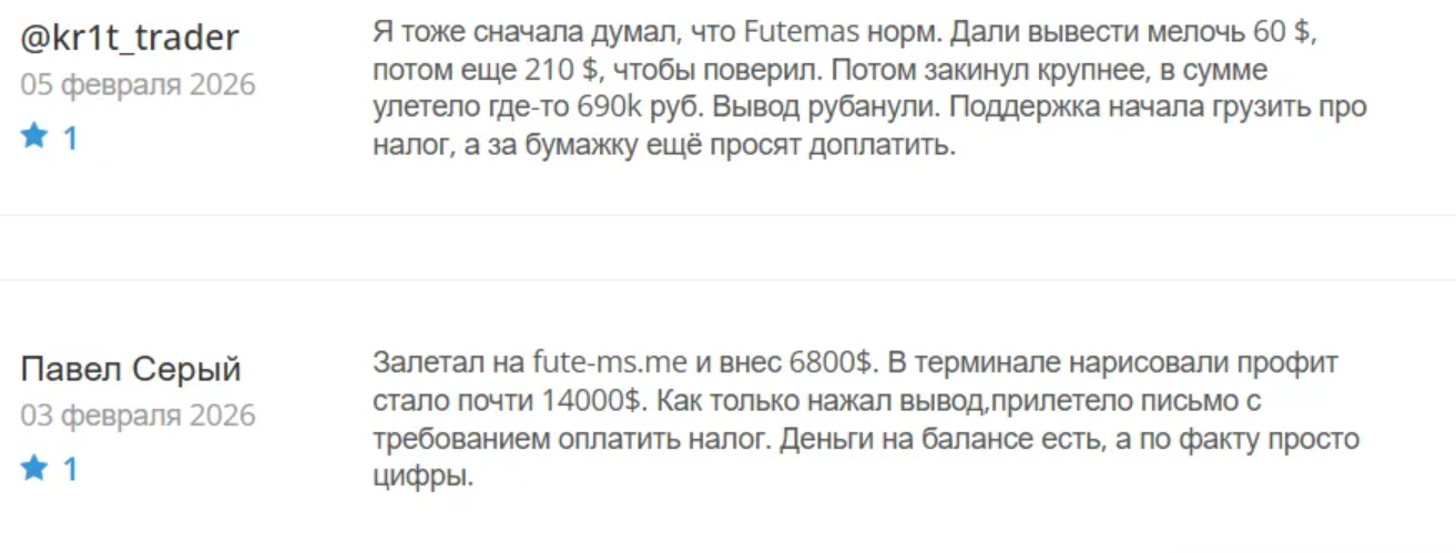 О брокере Futemas com отзывы встречаются только негативные. Все пользователи, которые сталкивались с данной площадкой, заявляют об обмане и невозможности вывести деньги. Некоторые сразу пишут, что это лохотрон, другие описывают распространенную мошенническую схему, по которой трейдера разводят на пополнение и при выводе, так как возникает необходимость оплаты страховки и других дополнительных взносов. Все отзывы о https futemas com высказывают недоверие к проекту.
