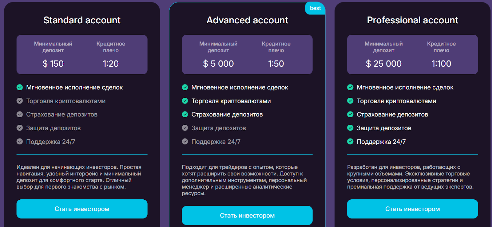 - Advanced – минимальный депозит 5 тысяч долларов, кредитное плечо 1:50;