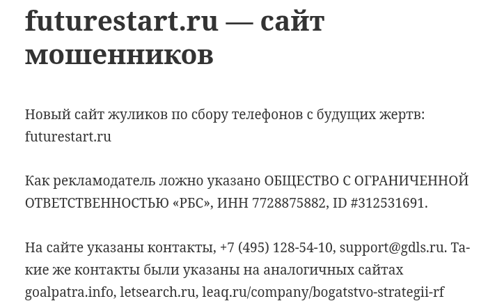 На профильных антифрод-порталах упоминается также, что контакты, используемые на сайте (включая почту support@gdls.ru), повторяются у ряда других лендингов с аналогичной схемой работы. Там же можно найти информацию о том, что юридические данные проекта не совпадают с реальностью, а реквизиты – «позаимствованы» у сторонних организаций. Именно так владельцы futurestart ru сохраняют анонимность и уходят от ответственности.