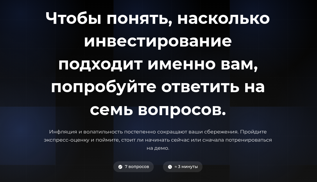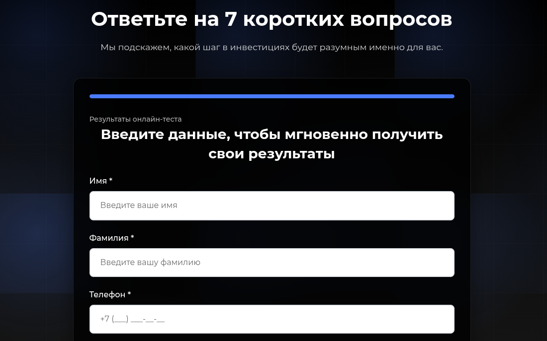 Главная страница проекта – просто рекламный квиз. Пользователь отвечает на пару-тройку банальных вопросов, и сразу после этого видит форму с требованием указать имя/фамилию, электронную почту и номер телефон. Без ввода данных результат теста, конечно же, не показывают. Все это вполне стандартный подход лендингов, которые работают не как образовательные сервисы, а как генераторы лидов для обзвона.