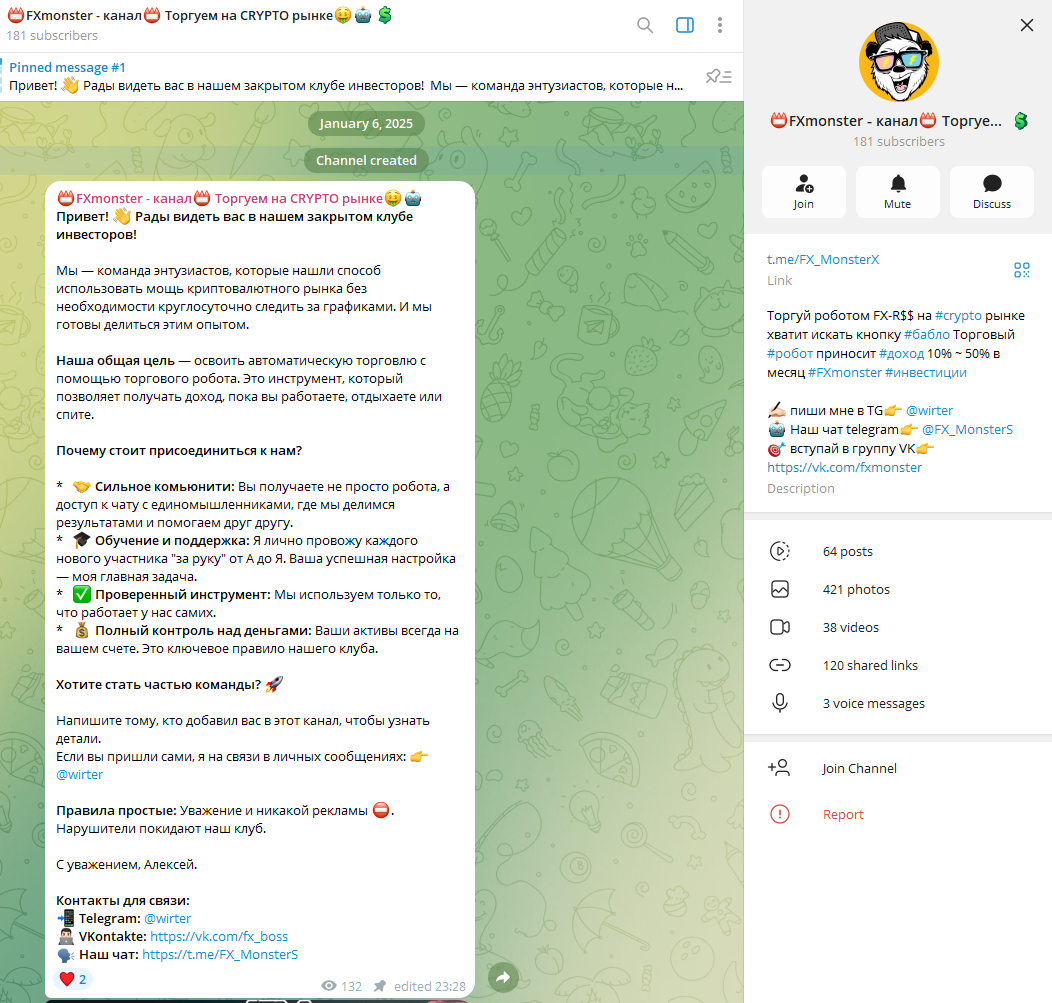 Канал в Телеграм, связанный с торговлей с помощью бота был создан только 6 января 2025 года: