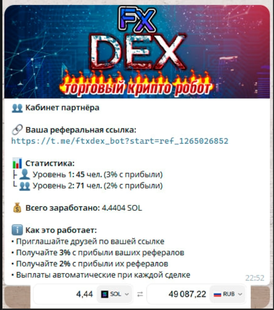 Суть работы бота заключается в том, что нужно сначала создать аккаунт на бирже Байбит, пройти верификацию, пополнить баланс, а потом зарегистрироваться уже в боте и вывести деньги с биржи на бота. А там – бот будет прокручивать пару SOL/FXRSS для получения видимой прибыли.