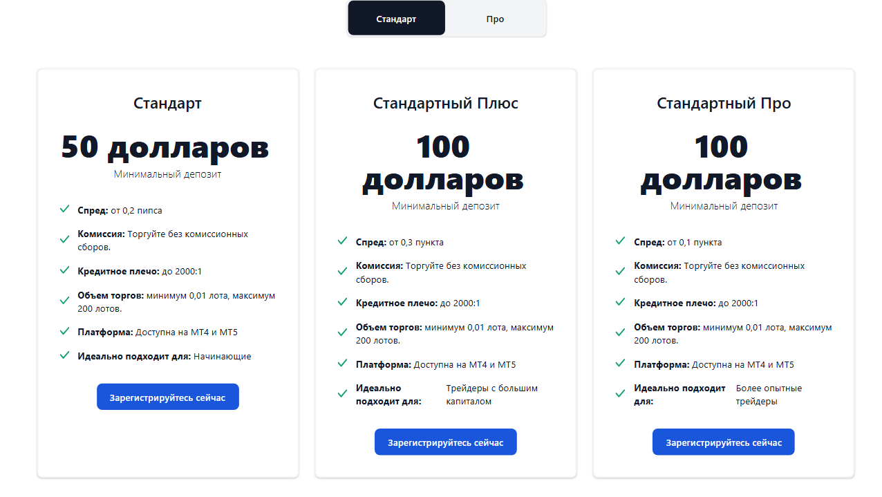 - «Стандартный ПРО»: взнос от 100 долларов, спред от 0,1;
