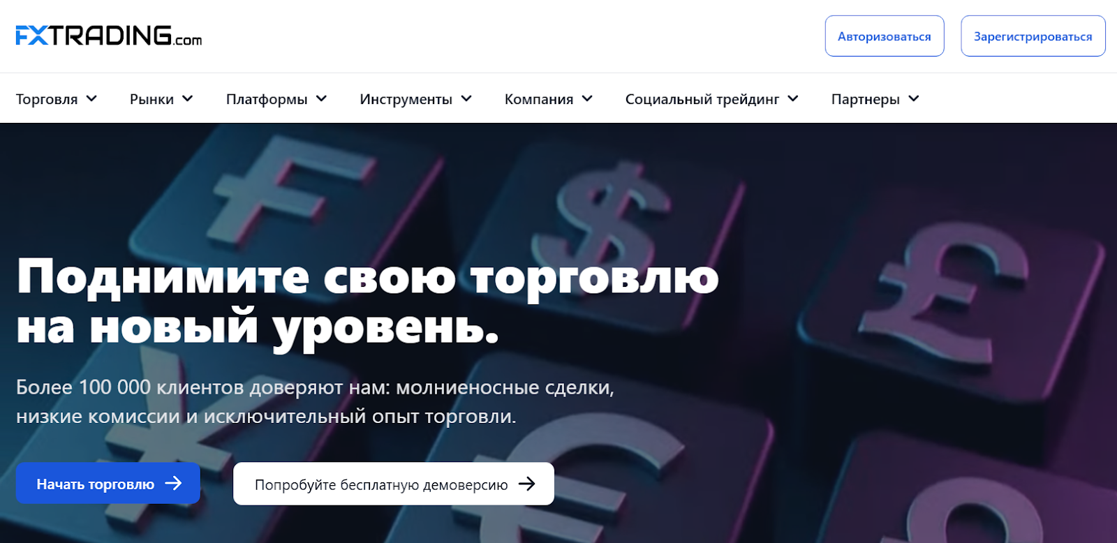 Официальный сайт брокера FX Trading – fxtrading com. Платформе доверяют более 100 000 трейдеров. Клиентам обещаны молниеносные транзакции, низкие комиссии и безопасность высшего уровня. Средства пользователей хранятся в банках с рейтингом надежности АА.