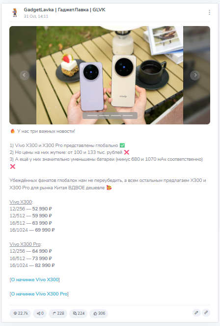 На канале «ГаджетЛавки» в «Телеге» выкладывали информацию о поступлениях товара, чаще всего это были мобильные устройства с большой скидкой. В посте представлено описание смартфона, а также указана его цена, дополнительно не сообщают об условиях сотрудничества.
