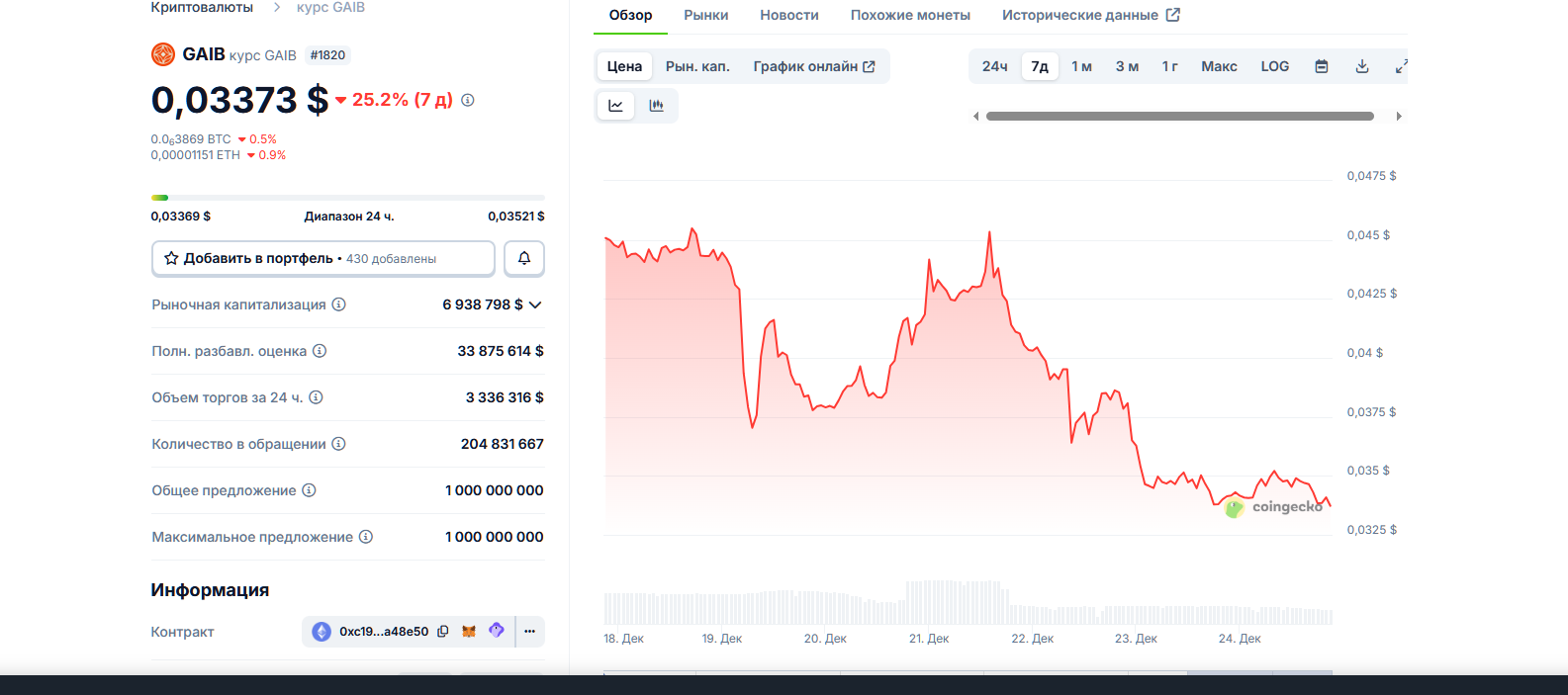 В результате стоимость токена начала уменьшаться. Вместо ожидаемых 0.08408 USD, на 24 декабря 2025 года монета торгуется по цене 0.03373 USD, демонстрируя снижение на 25.2%.