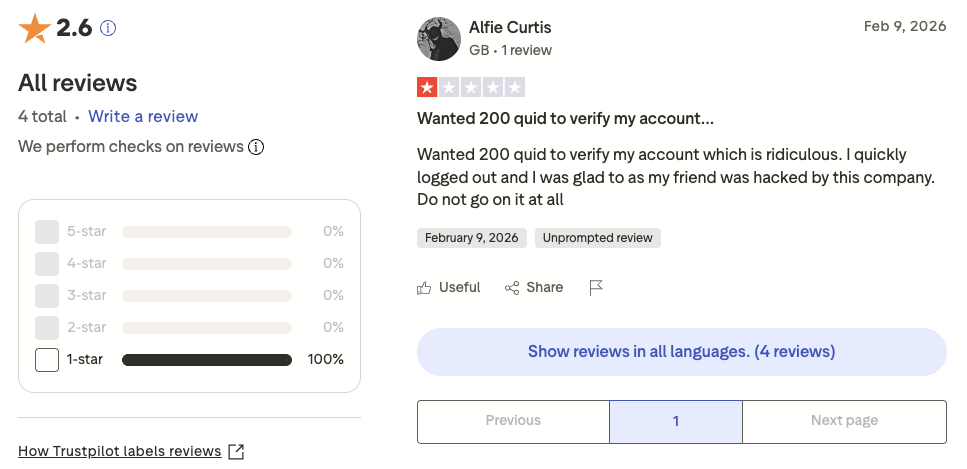 Автор одного из ревью на сервисе Trustpilot сообщил, что от него потребовали пройти верификацию за 200 фунтов стерлингов. Это произошло, когда он попытался вывести выигранные деньги. Подобная схема развода очень распространена, ее применяют в казино, телеграмм-играх и других проектах, созданных скамерами.