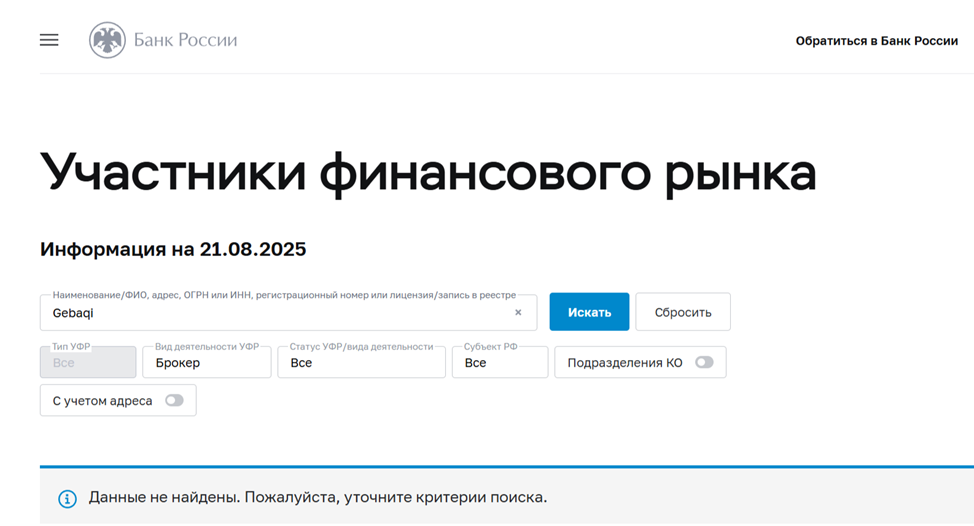 Отзывы о Gebaqi являются не единственным подтверждением того, что брокер ненадежный. В ходе проверки мы узнали об отсутствии у него официальной лицензии от ЦБ РФ. Поэтому сайт не может заниматься легальной деятельностью на территории России. Значит, он работает неофициально, а пользователи не защищены законом.