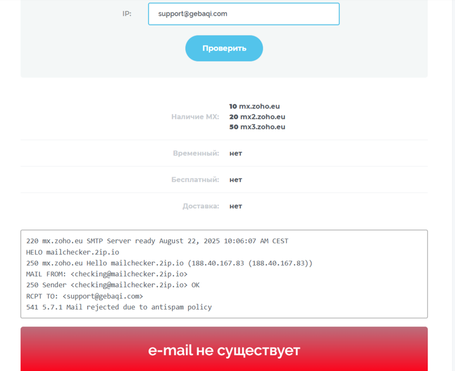 На сайте указано, что пользователи могут обращаться в поддержку по e-mail. Контактом служит адрес support@gebaqi com. Но в реальности электронной почты не существует – это показала проверка через специальные сервисы. Так что пользователям некуда обратиться за помощью в случае возникновения вопросов.